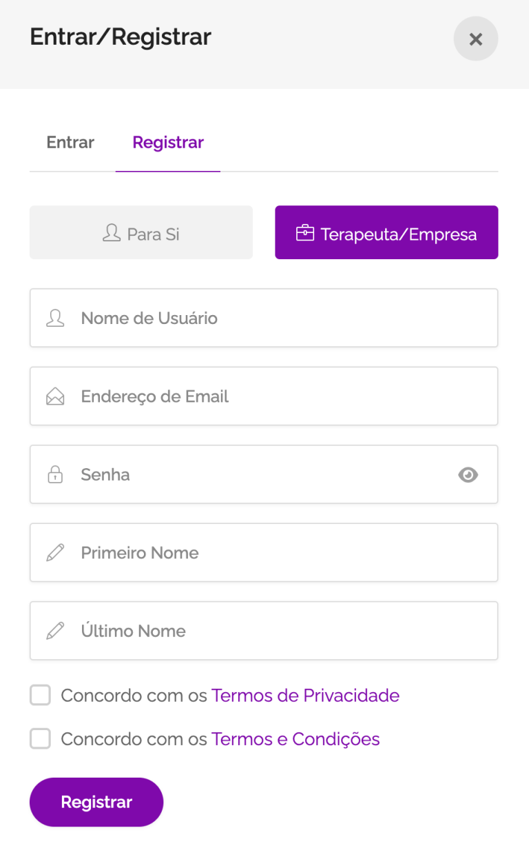 Escolha a opção Terapeuta / Empresa