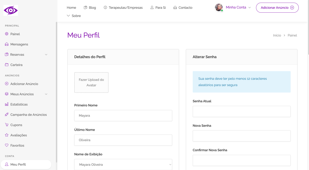 Após completar o cadastro e actualizar o seu perfil, terá acesso ao Painel do Terapeuta.