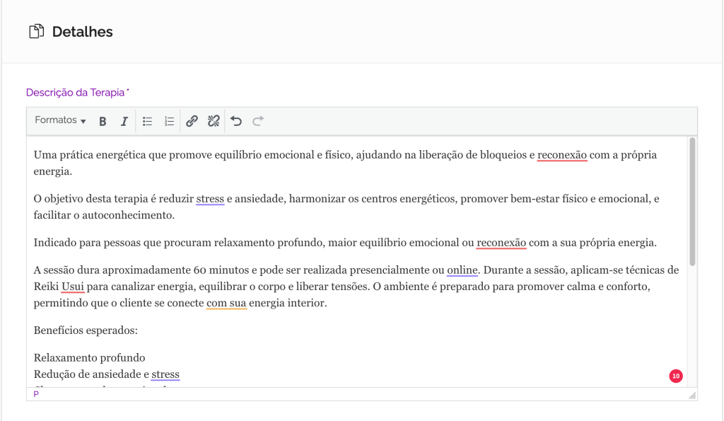 Ao criar uma listagem, é importante descrever completamente e de forma completa. Esta é a parte que permite aos clientes entender quem você é, como atua e quais os benefícios da sua prática.