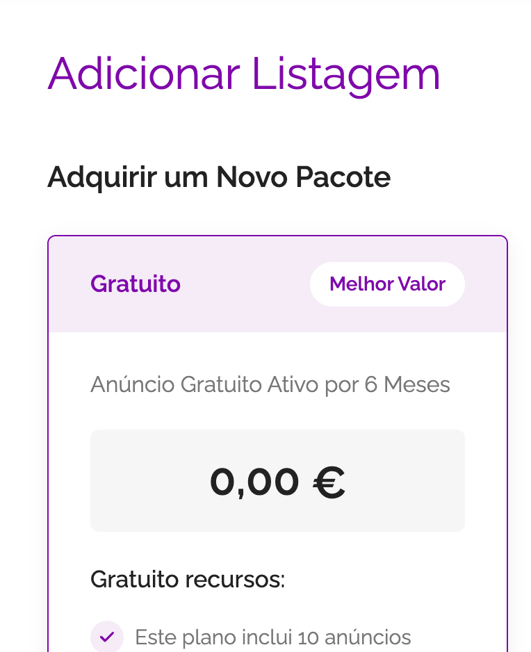 Selecione o pacote desejado e clique no botão “Continuar” para prosseguir com o cadastro da sua listagem.