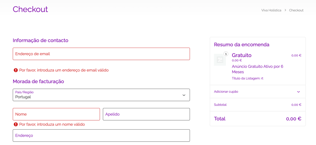 Em determinado momento do processo, será redireccionado para a página de pagamento (checkout).